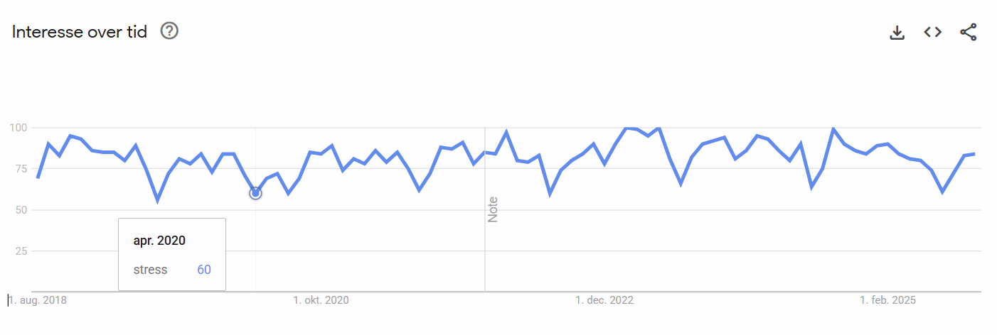 Vi er mere stressede i november end i juli. Det kommer nok ikke bag på nogen, at sommerferien er det mindst stressede tidspunkt på året. I følge Google Trends tager stresskurven også et dyk i julen. Kun ét tidspunkt på de sidste 8 år, er den årlige stressrytme blevet brudt. Det var under Corona lock-down. Det er tankevækkende at en tid der var kaotisk og usikker, på ingen måde var stressende. Det er tydeligt at selvom vores arbejdstilværelse ikke er den eneste kilde til stress, så er det langt den største.